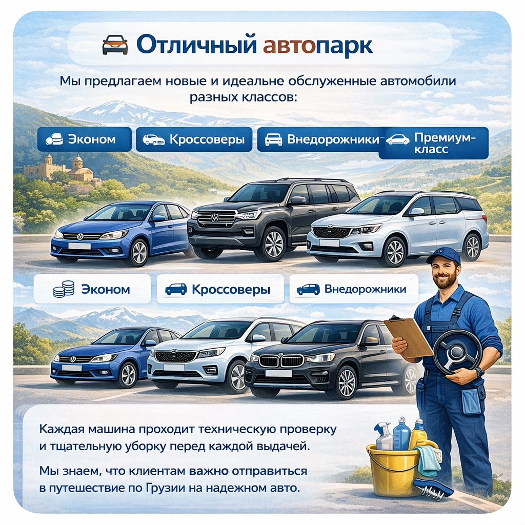 Мы знаем, что клиентам важно отправиться в путешествие по Грузии на надежном авто.